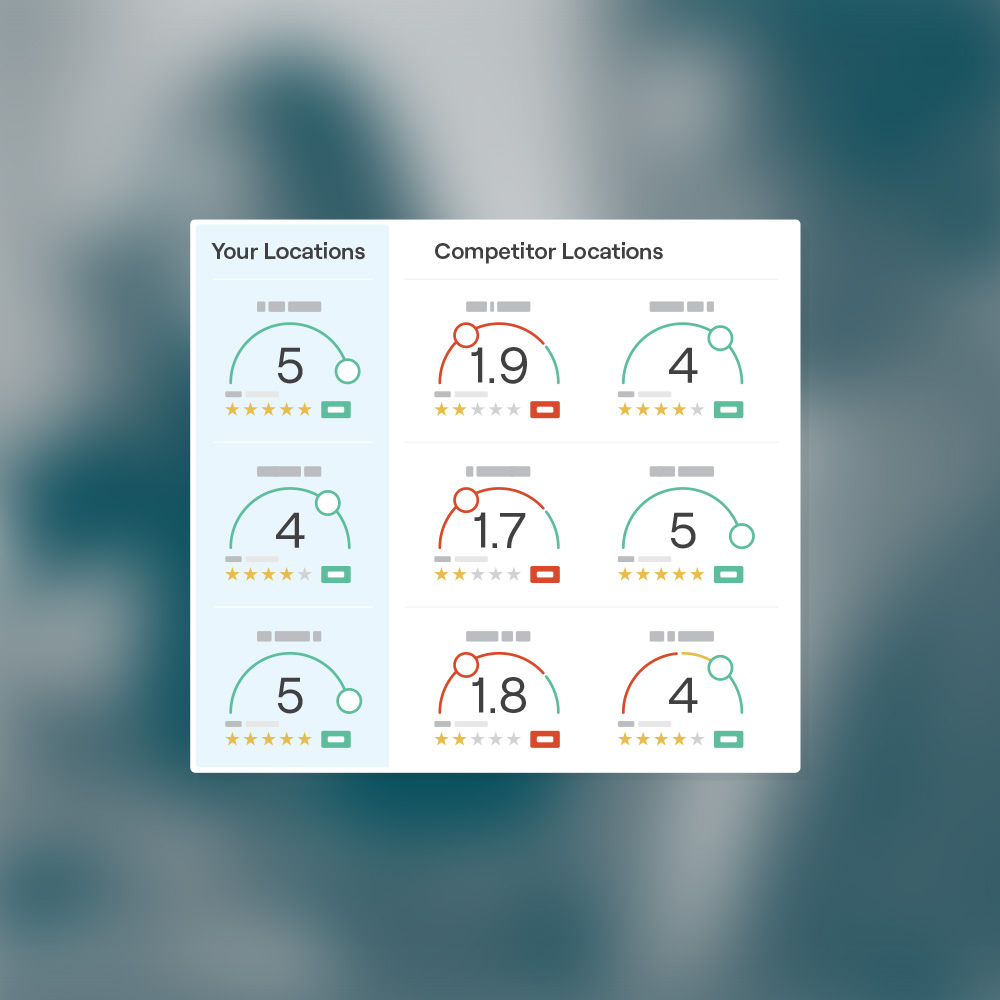 Provides a direct, real-time comparison of review volume, average star ratings, and response times against any competitor in any local market, identifying exactly where to focus.